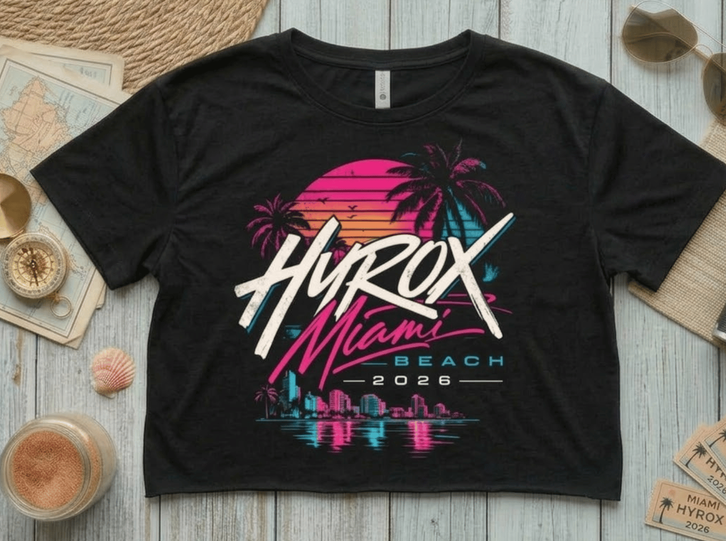 Bring the heat to race week. The HYROX Miami Beach 2026 Crop Tee is built for athletes who train hard, move fast, and live bold. Featuring a vibrant retro-Miami sunset graphic with palm silhouettes and skyline reflections, this limited drop captures the electric energy of HYROX on the beach.
